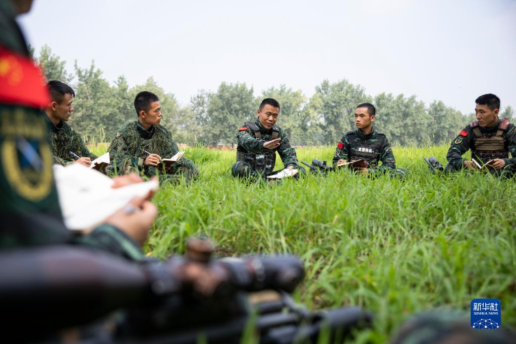 武警河北總隊某部大隊長李闖(右三)和特戰(zhàn)隊員進行理論研討(2022年8月3日攝)。新華社發(fā)(江騰 攝)