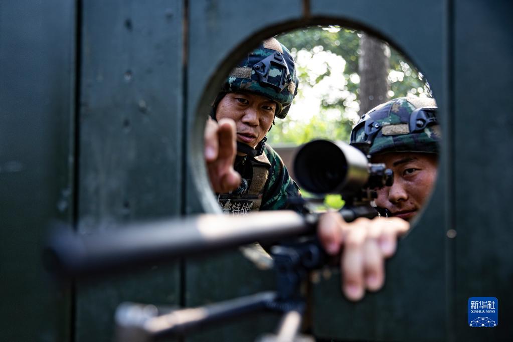 武警河北總隊某部大隊長李闖(左)指導特戰(zhàn)隊員狙擊訓練(2022年8月3日攝)。新華社發(fā)(江騰 攝)